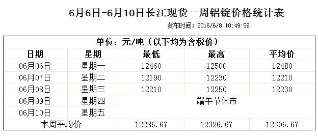 6月6日-6月10日長江現貨一周鋁錠價格統計表6