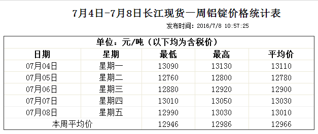 7月4號(hào)-7月8號(hào) 長(zhǎng)江現(xiàn)貨一周鋁錠價(jià)格統(tǒng)計(jì)表