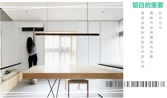 現(xiàn)代社會信息量龐大,試著在生活中拿掉些甚么,提醒自己適當(dāng)放松卻又不能太過,「平衡」是留白哲學(xué)的關(guān)鍵之一,為緊湊的生活建置一小塊能夠呼吸的空間給自己,慢慢領(lǐng)略是「時間」讓空間中的留白發(fā)揮了作用。